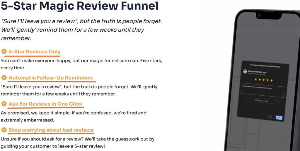 Stone Systems claims that their 5-star magic review funnel helps you get only 5-star reviews. This includes automated follow-up reminders and 1-click processes. However, this practice is questionable and may get your profile banned.